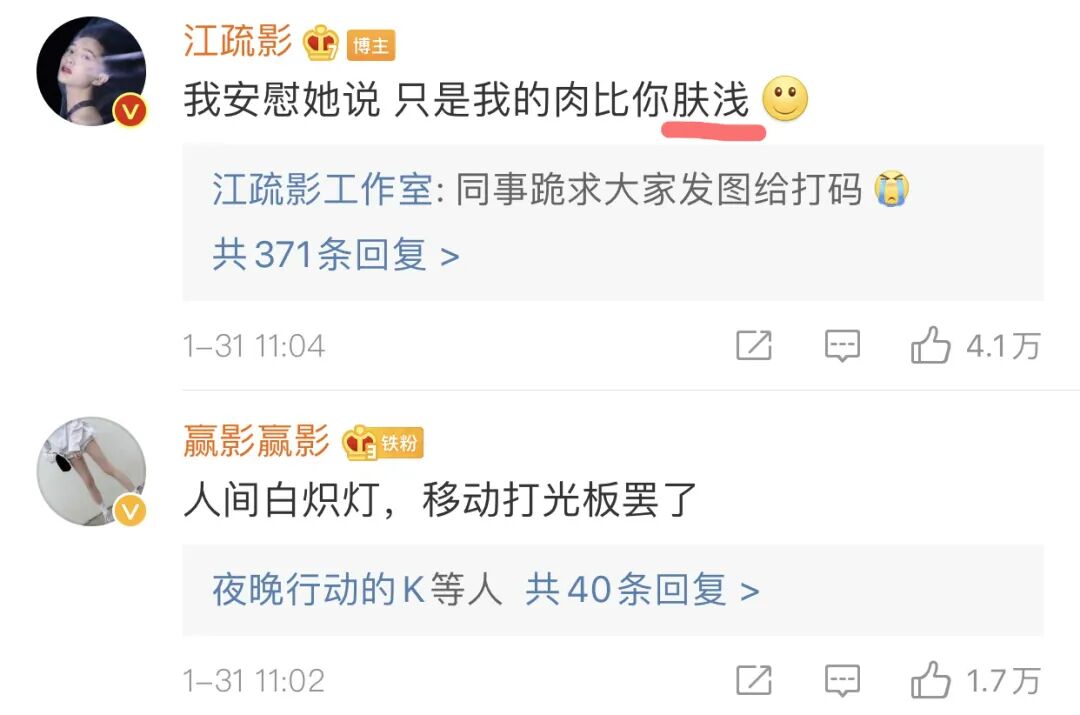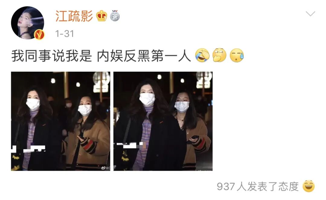 不久前,江疏影晒出了自己和同事的被拍合照,诠释称:“我同事说我是内娱反黑第一人。”