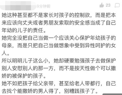 很多看了这幕的网友都说董洁对儿子的关系不像是母亲对儿子的关系,更像是一个恋爱女人对男朋友的索取,硬要本来应该被保护的孩子反过来保护她。