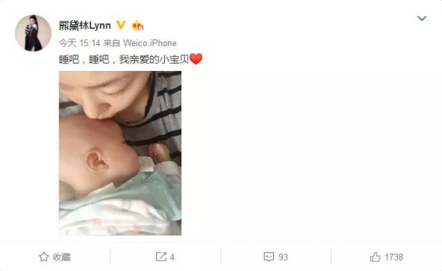 昨天,熊黛林在社交平台上上传了一张怀抱女儿的照片。照片中的熊黛林素颜出镜,亲吻着女儿的额头,母女二人皮肤白皙,熊黛林还配文称:“睡吧,睡吧,我亲爱的小宝贝。”