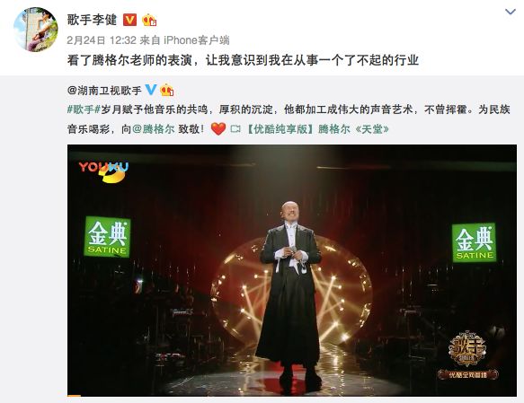 也难怪诗人歌手李健在看完腾格尔的表演后,隔空向腾格尔老师表达敬意:
