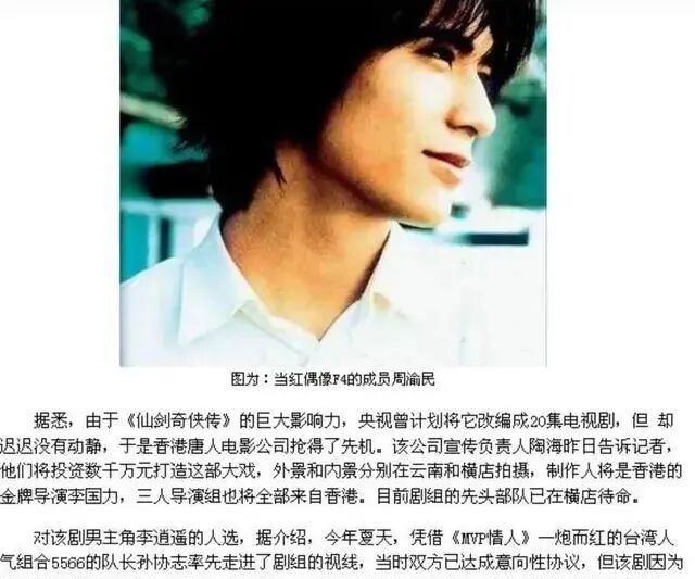 回看周渝民的演艺生涯,私下低调的他其实不算是因为佛系而耽误自己演艺事业的艺人。F4组合当年有多火不用累赘了,“花泽类”的人气更加不用质疑。不过在偶像剧盛行的年代,有传周渝民本来有机会出演《仙剑奇侠传1》“李逍遥”一角,但最后不知道为什么,他跑去演《战神》。