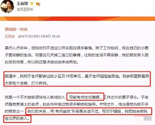 自己和于和伟是良师益友,由于自己社交障碍,于和伟带她去姐姐家里去打了麻将,吃了夜宵。