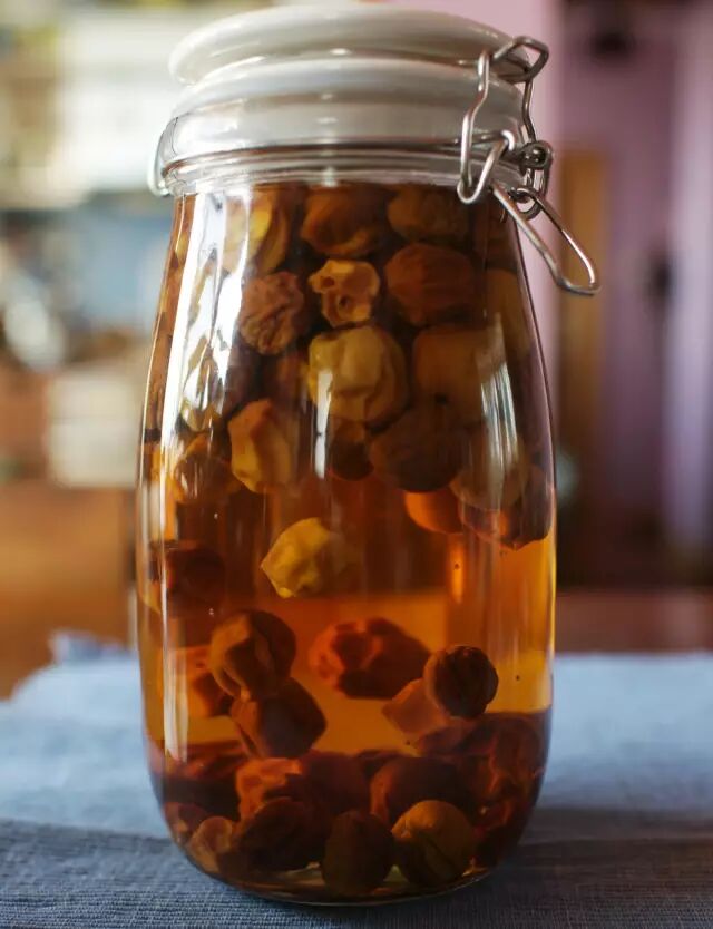 在释放出所有的香味之后,原本浑圆的梅子会变得皱成一团,无色的酒体变成了晶莹剔透的琥珀色、甘甜、香气悠长。用来酿造的基酒不能太香,也绝不能度数太低或者太高。最后的颜色,就象电影中大姐香田幸送给妈妈的那瓶——姥姥生前酿的11年梅酒,色泽深沉,却又通透澄明。