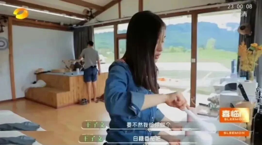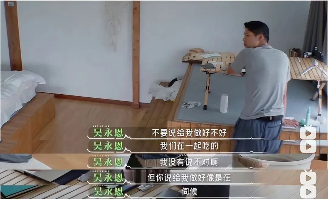 在节目里她对吴永恩说,我给你做个白糖番茄吧。吴永恩却说,什么叫给我做,明明是我们一起吃。她说想吃点好的,吴永恩却觉得麻烦,随便吃点吧。她生闷气了,吴永恩也无视她,任由她一个人独处,自行消化。