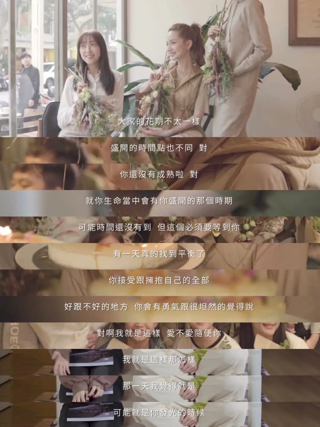 柯佳嬿说:“大家的花期不太一样,盛开的时间点也是不同的,你生命中会有你盛开的花期,可能时间还没到。这必须要等到你有一天真的找到平衡了,你接受跟拥抱自己的全部、所有好与不好的地方,那一天就是你发光的时候。”