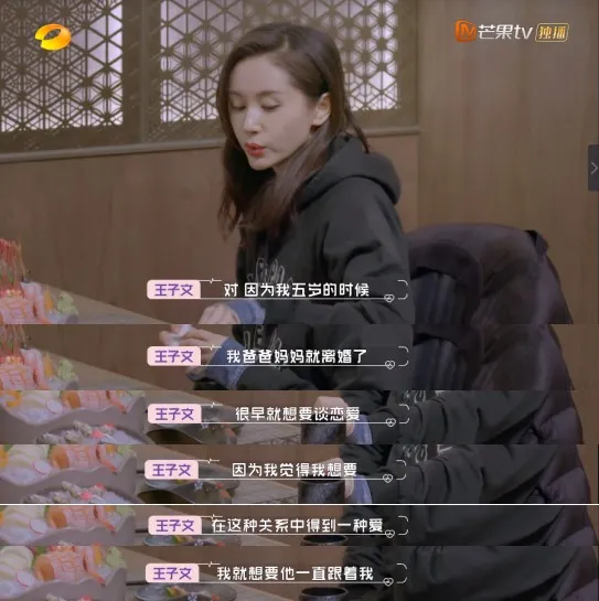 王子文哭着说,她不能自行满足自己对爱的需求,她总觉得这是种缺陷,因为总是奢望从别人身上获取爱和安全感。