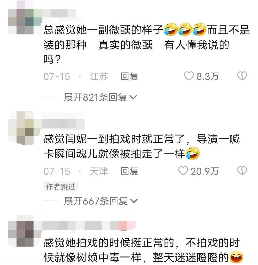 简而言之,就是闫妮除了拍戏的时候很清醒,剩下的时间总有一种“我是谁我在哪我在干什么”的五迷三道的朦胧感。