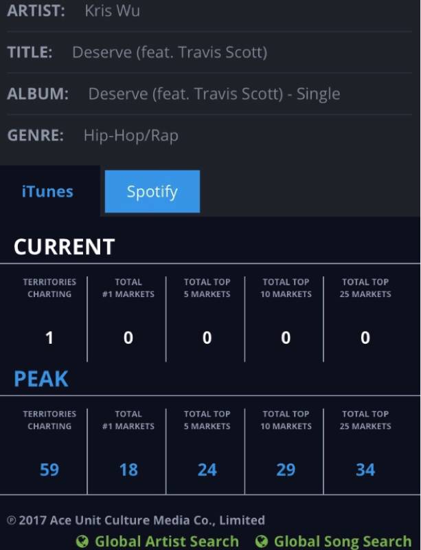 在《中国有嘻哈》第一季结束后,吴亦凡推出了单曲《Deserve》,发布仅两小时后便登顶美国iTunes总榜第一,夺得华人在iTunes榜的最好成绩,后来更是在全球十八个国家及地区的总榜斩获第一;近日发布的献给时尚界的新作《B.M》亦登上总榜第二,成绩斐然。