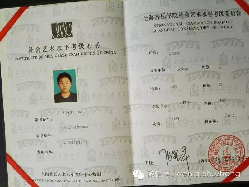 陆俣蒙,文来初中九(12)班学生。自6岁(2008年,小学一年级)开始,师从覃建华老师学习大提琴,2009年第一次考级(上海音乐学院)即跳考三级一次性通过,后来又先后考级通过了五级、六级、跳过七级直接通过八级、九级,2015年10月在参加上海音乐学院社会艺术水平考级最高级十级的考试中,获得优等。