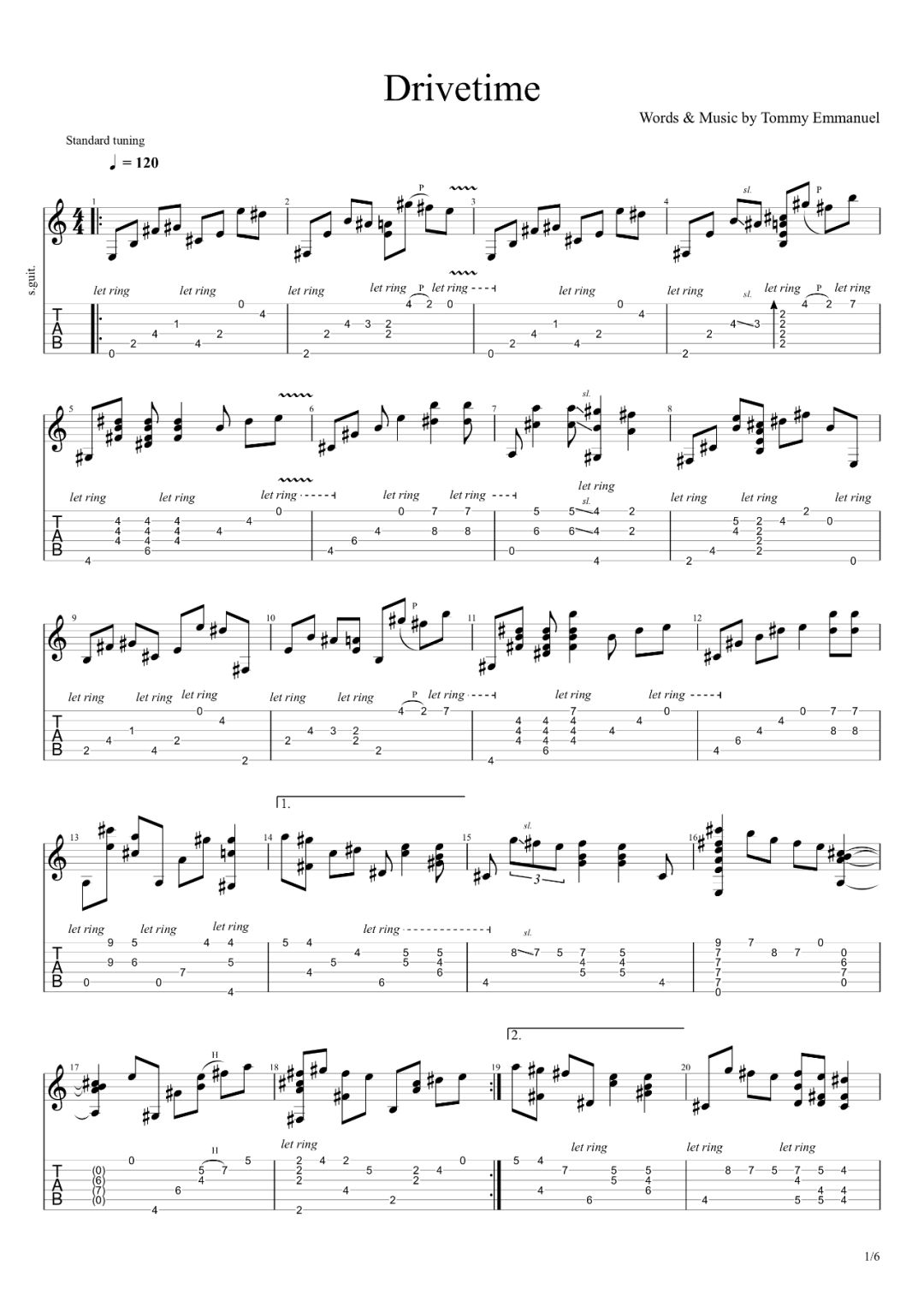 今天,茂茂给各位推荐的是来自Tommy Emmanuel的作品《Drive Time》,作词作曲均是Tommy Emmanuel,这首作品是Tommy为他第第一个女儿Amanda所写,因为Amanda喜欢长途旅行,所以写下了这首作品。这首作品录音所采用的设备为相机Canon 7D, 麦克风为Rode K2, Audio Technica 8033。作品也充满着Tommy的个人色彩,作为美式指弹的代表人物,他在指弹界的地位是毋庸置疑的,而练习他老人家的曲子,也是很多人的愿望,这不,茂茂又花费了诸多时间,终于找到了这首作品的谱子,特此分享给大伙,找谱不易,做谱的人更不容易, 别辜负了茂茂和做谱人的心,不多说,直接上干货。