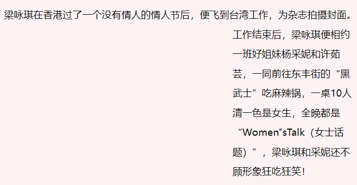 2008年情人节过后,梁咏琪就被拍到从香港飞去台北就为了和杨采妮、许茹芸一起吃火锅。
