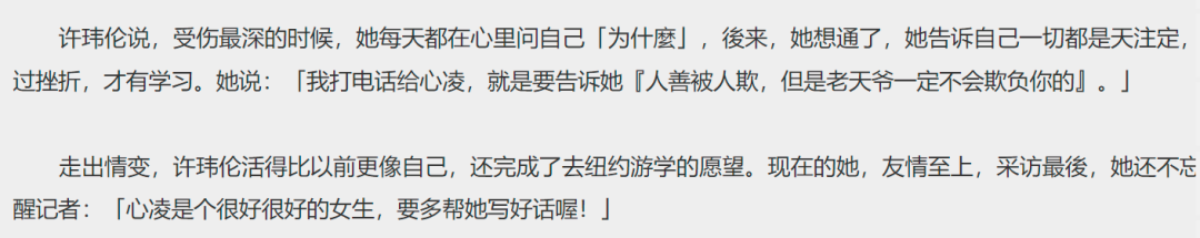 话说回来,当许玮伦听到王心凌失恋的消息之时,也会第一时间打电话安慰她,还把当年情伤自我鼓励的话送给她:“人善被人欺,但老天爷不会欺负你的”。