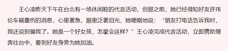 当听到车祸消息的时候,王心凌当天还在台北有工作。但她结束工作后立刻携助理冲到台中,为许玮伦集气加油。