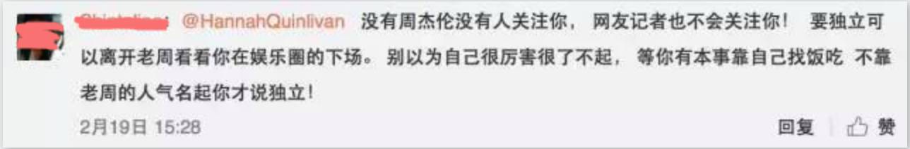 所有的称呼,都是周杰伦的妻子,而不是昆凌;几乎所有留言中,都涉及周杰伦或她的家庭,而不是她个人。大家都说要让大嫂照顾好我们大哥,却没有人说“昆凌你要照顾好自己”。仿佛这些铁杆粉和周杰伦才是一体的,而昆凌只是一个附属品。