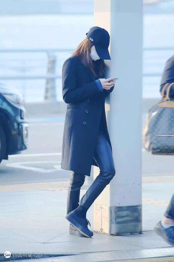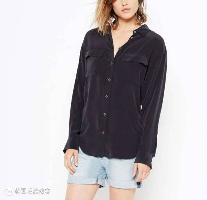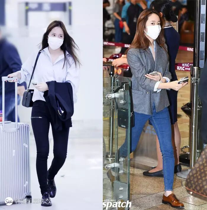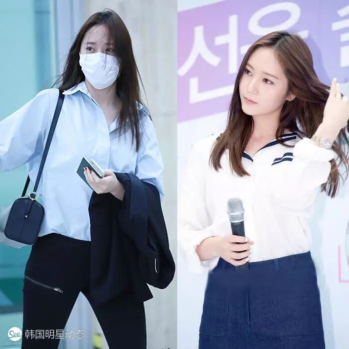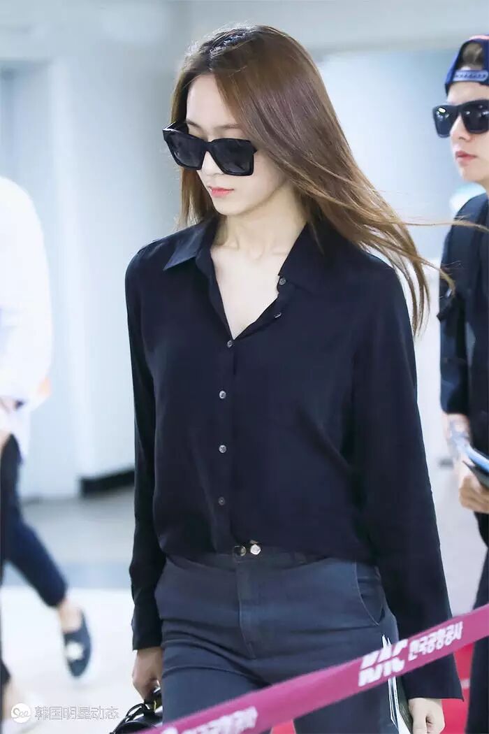 平时上衣都是黑白蓝的衬衫居多,我真觉得郑秀晶是最会穿衬衫的韩国爱豆了,每一次都像是量身为她定做一样。