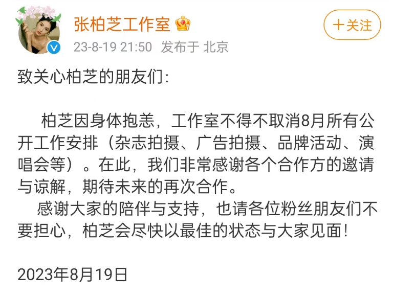 前几天,张柏芝工作室忽然宣布:柏芝因身体不适,取消了所有8月公开工作安排。