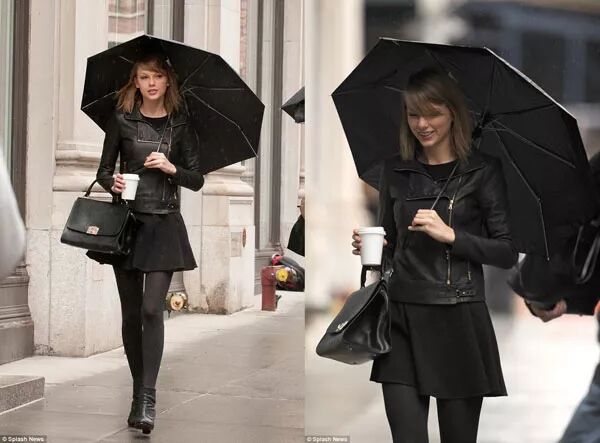 帅气的机车皮衣是不少明星挚爱的单品。Taylor Swift选择了用优雅简约的连衣裙来搭配帅气皮衣,这么一番风格混搭,倒也有水乳交融的效果,最后再配上高跟小短靴,一身全黑的搭配也没使她失去星味,反而打造出了属于自己优雅冷艳的风格。