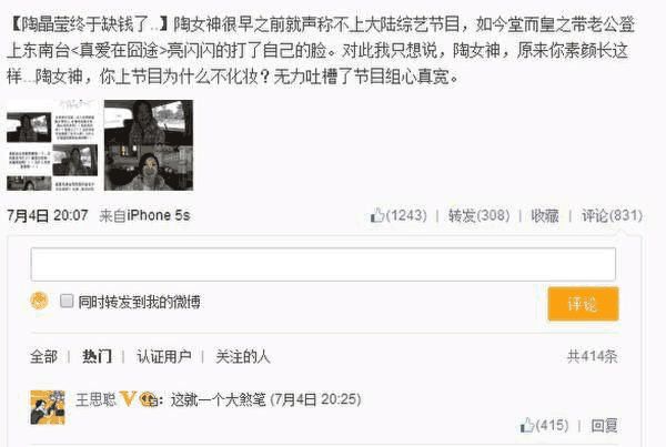 三:自称不差钱的陶晶莹近几年却频频出现在她觉得太穷的内地,在各档综艺节目中捞金,《快乐男声》、《最强大脑》、《真爱在囧途》《吐槽大会》《蒙面唱将猜猜猜》《幻乐之城》等,在节目中也经常发出一些出位的言论引起争议。面对陶晶莹这种一边狂喷内地不好,却又一边来内地捞钱的明星早前娱乐圈纪检委员王思聪同学怒怼陶晶莹:这就是一个大(哔哔和谐音)。