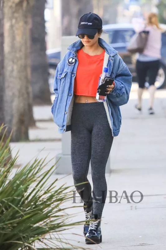 橘色的运动卫衣搭配灰色Leggings,外搭一件宽松的牛仔外套就变成了休闲的逛街装扮。