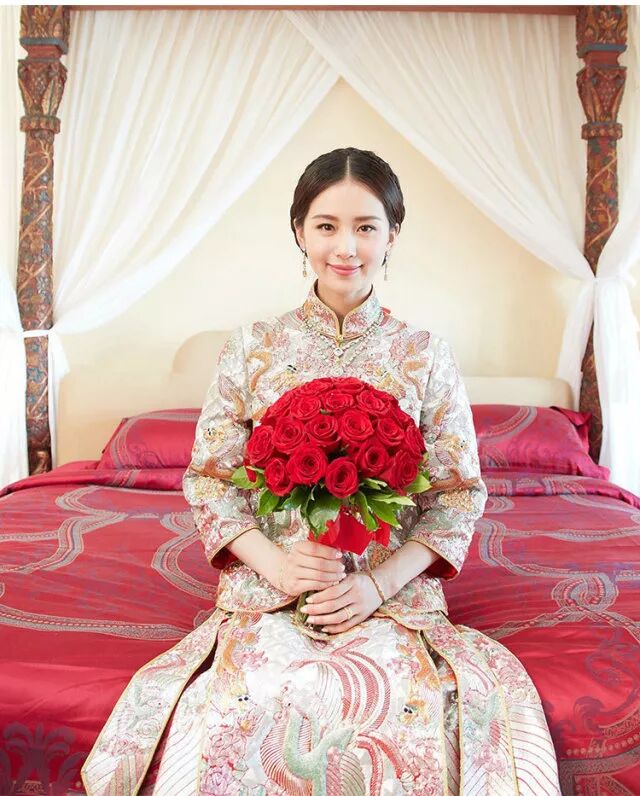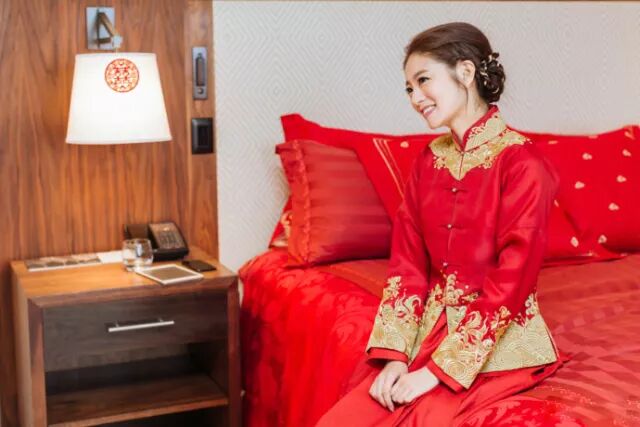 而身穿龙凤褂的新娘因为直筒裙摆的束缚,最好就是坐在床沿,展现温柔娴静的一面。