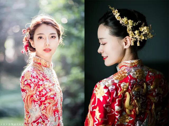 如果是西式婚礼,龙凤褂和秀禾服都是适合接亲和出门的时候穿;龙凤褂的剪裁和设计干净利落 ,比起宽松的秀禾服更适合当作敬酒服。
