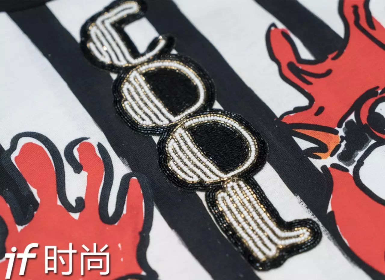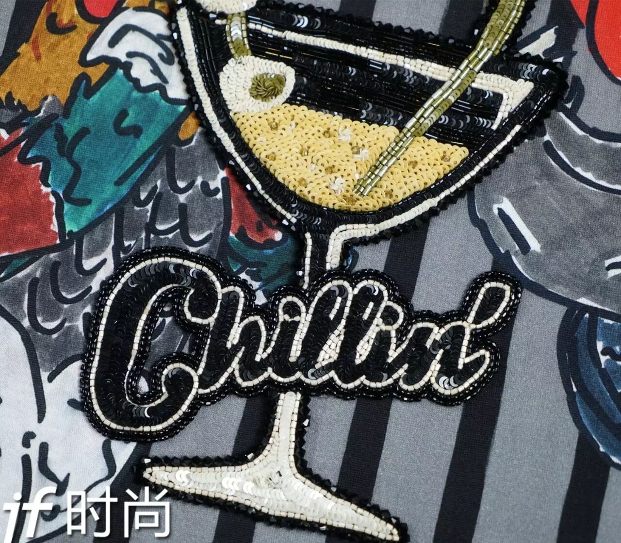 ▲与鸡图案印花相辅相成的是T恤上的钉珠亮片装饰酒杯图案和花体字母图案。钉珠排列很工整,做工细致,亮片则通过颜色的区分制造出层次感和立体感。