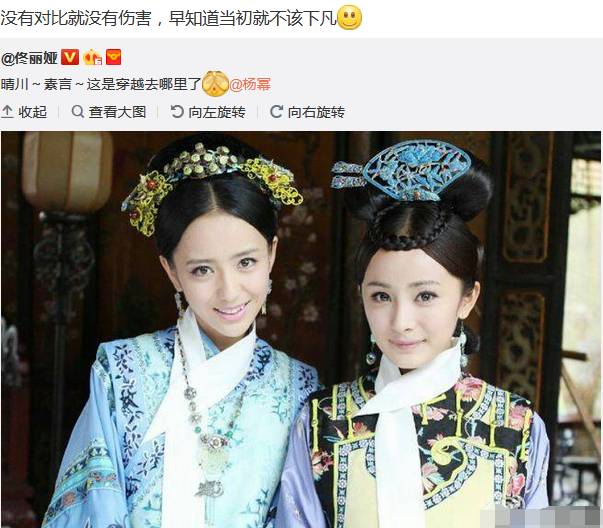 前不久,杨幂在微博晒与佟丽娅合影,调侃自己的颜值。
