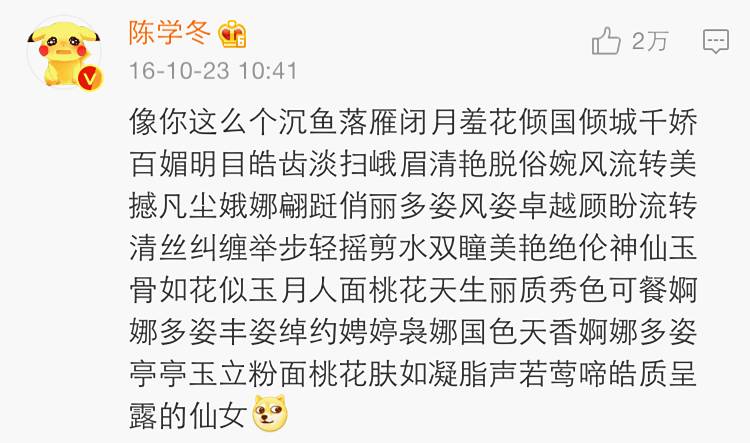 陈学冬高情商回复,全程没有一个逗号,却都是“美丽代言”的形容词。