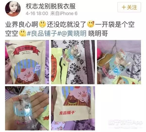 事情是酱紫的,昨天有个姑娘买了一系列良品铺子的零食,就素晓明哥代言的这个↓