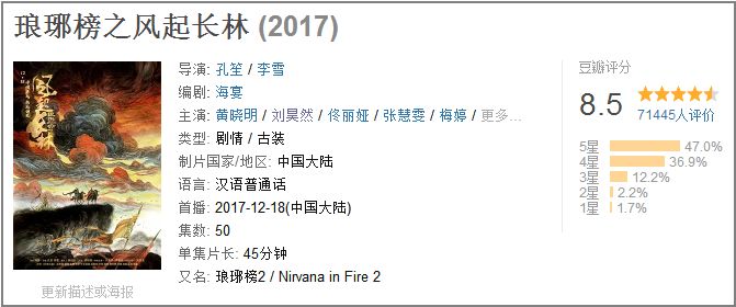 电影之外,昊然底迪的电视剧之路也走得很稳,第一部担任男主角电视剧就是《琅琊榜之风起长林》,这一部获得的关注虽然不及上一部,但也是良心制作,口碑国剧。
