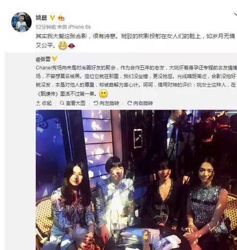 随后,姚晨转发了经纪人的微博,写道:“其实我大爱这张合影,很有诗意。斑驳的树影投射在女人们的脸上,如岁月无情又公平。
