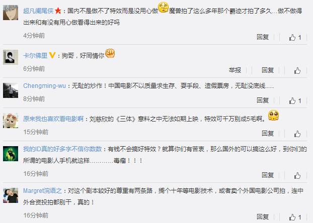 还有的则对国内的科幻电影水平不看好,只求能把故事说清楚。