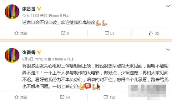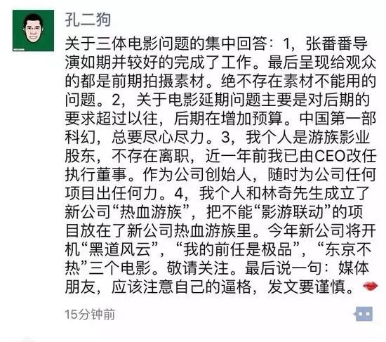 而今天凌晨,网上有爆料称,电影《三体》上映将无限期推迟,因为影片监制、出品方游族CEO孔二狗已离职,导致团队解散,因电影质量问题,特效团队也已被更换,导演张番番拍摄的素材也都被弃。What?