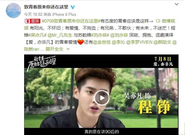 在《致青春原来你还在这里》的特辑中,吴亦凡直言:“这是一部真的是在讲90后的青春爱情故事电影”。