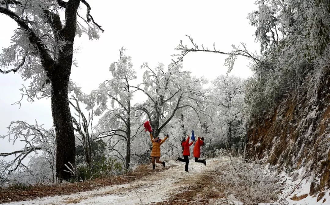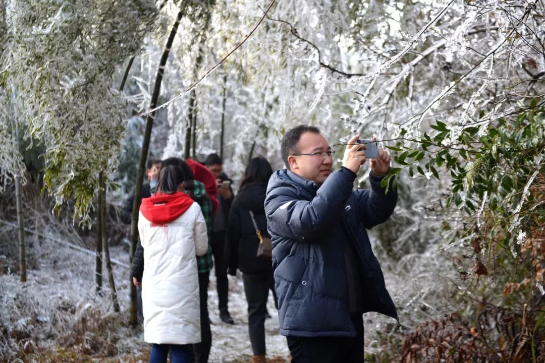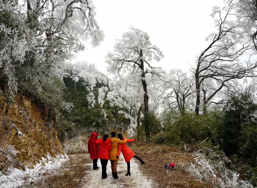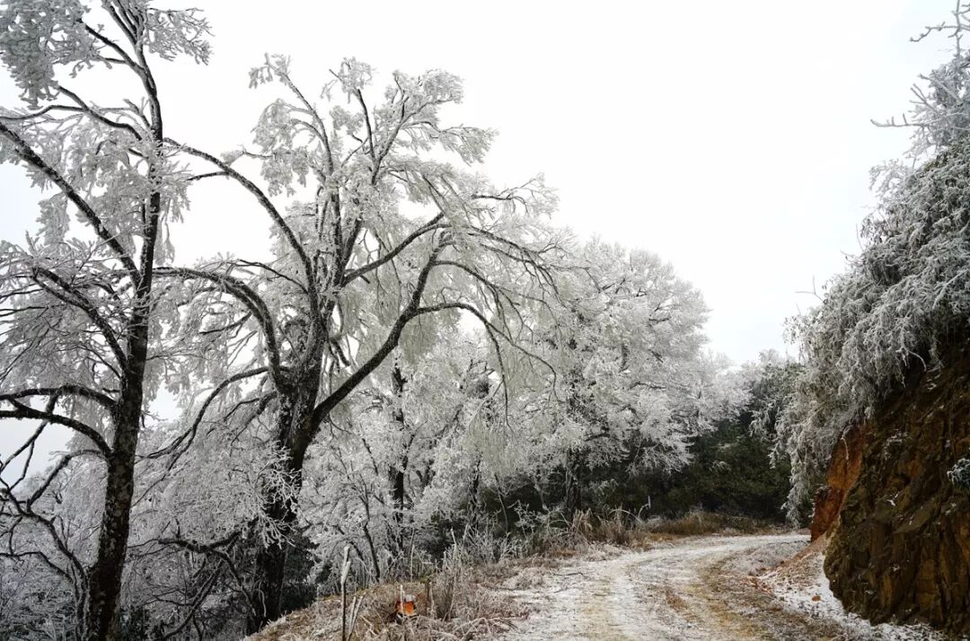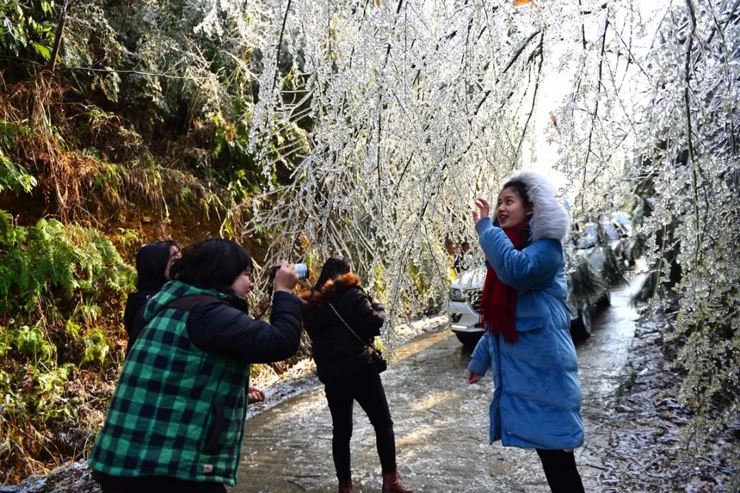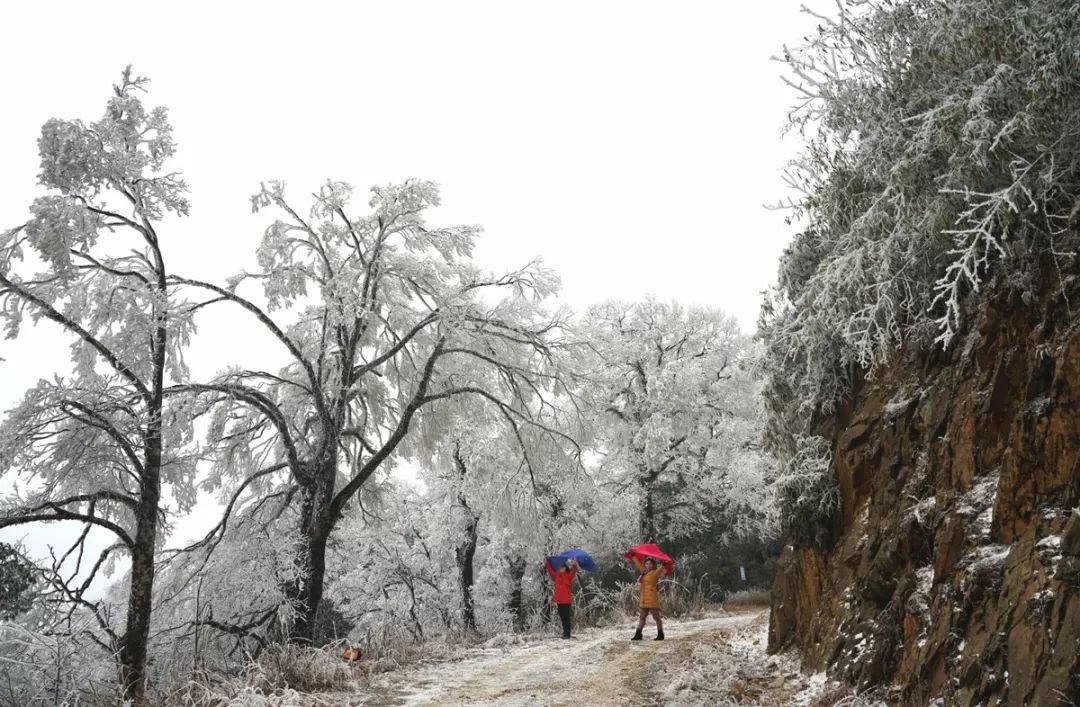 连日来,受强冷空气影响,广西龙胜各族自治县最低气温降到零度以下,加上连日来雨雾交加,气温持续低迷,满山的树木都挂满了雾凇。在海拔600米以上的南山、彭祖坪、西江坪、伟江花界、乐江地灵、平等上社、江底建新、龙脊平安等高寒山区出现“千崖冰玉里,万峰水晶中”的壮美雾凇景象,这是龙胜县入冬以来的第一场较大规模的雾凇冰挂景观。满山遍野的雾凇、冰挂如“冰雪奇缘”般的童话世界,引来不少观赏者。放眼望去,一片雪白的世界,树木和草丛,或被雾凇装扮得银装素裹,或被冰挂装扮得晶莹剔透,美不胜收。山上的游客或互相拍照留影,或漫步雪白的世界,享受着南方难得的冬日美景。