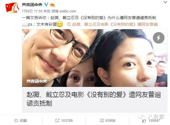 赵薇执导的第二部电影《没有别的爱》自主创名单公布以来就麻烦不断:男主角戴立忍被人爆料有台独倾向,曾积极参与多项台湾民进党主导的政治运动;而水原希子则被曝曾参拜靖国神社并给辱华照片点赞。经过一个多月的争议,最终在7月6日这天由共青团中央官方微博发布的微博《一篇文告诉你:赵薇、戴立忍及<没有别的爱>为什么遭网友普遍谴责抵制》将事态瞬间推向高潮。