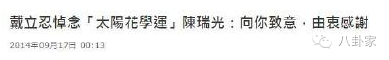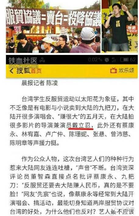 说回戴立忍,他申辩的理由是“作为社会人对现实总有一份关注”,但作为一名有理性的成年人,对于自己参与“太阳花反服贸”运动、“反课纲”运动这样的政治运动在他人眼里、特别是在大陆敏感的民众眼里意味着什么,应该是心知肚明的吧。明知而去做,说明他心中已对利弊做过衡量,既然当时表达政治观点的欲望战胜一切,那今天就不要反过头来埋怨现状,怪大陆人民不给你钱赚。
