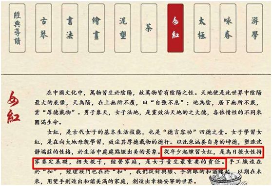 我们来看看华夏学宫开设的课程,在女红这门课的描述里,赫然写着“为日后女性持家奠定基础,相夫教子,经营家庭,是女子一生最重要的责任”。