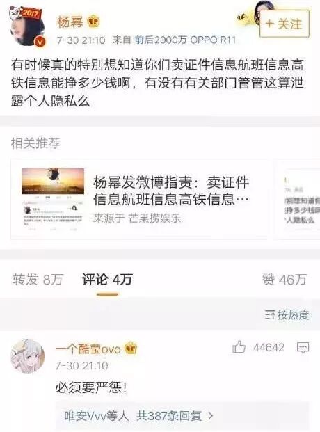 这种售卖明星航班行程信息的灰色产业链,遭到了不少明星的指责。杨幂、刘涛都曾经在微博上控诉这种行为。虽然这种行为属于违法,但从客观事实来讲,也很难杜绝。