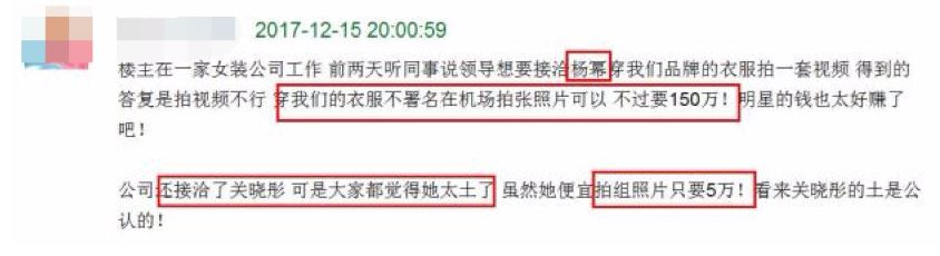 此前就有网友在豆瓣爆料,“带货女王”杨幂的一套机场街拍竟然开价150万。而新晋小花关晓彤则因时尚形象还未建立,惨遭市场嫌弃。