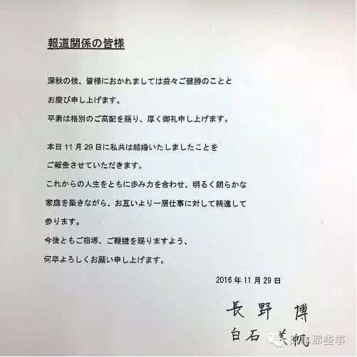 据悉,长野博是在主持综艺节目时结识担任来宾的白石美帆,因为搭档泷泽沙织和女方是好朋友,透过其牵线后开始更进一步接触。