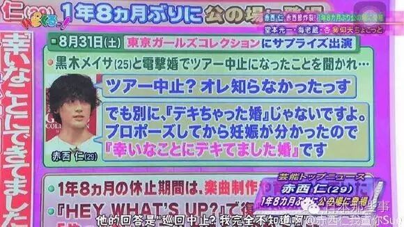 不过事后赤西仁表示自己对巡演一事并不知情,同时表示自己和黑木明并非“奉子成婚”,而是“在自己求婚后女方才怀孕的”。