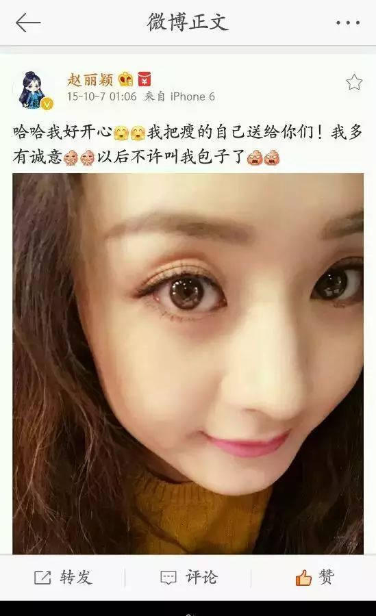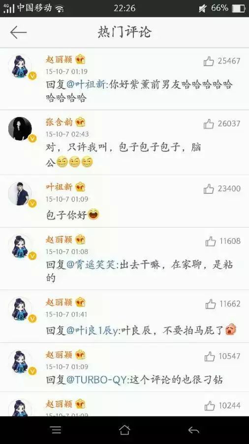 然后呢是某天妹子发了条微博和萤火虫们说把瘦了的自己送给粉丝们 以后粉丝不可以叫包子了~然后叶祖新评论了一下 ,赵丽颖回答:“ 你好 紫薰前男友 哈哈哈 ”。叶祖新该多尴尬…然后萤火虫们就去叶祖新微博下评论希望他不要介意,不过还是好尴尬。