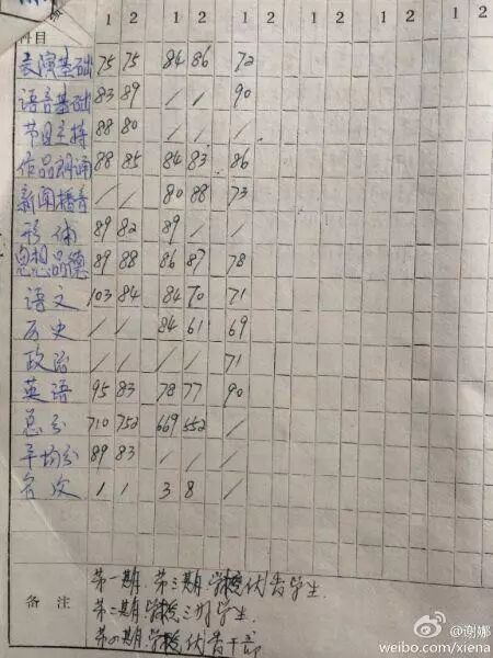 她还留言感慨说:“记得我第一次去四川电影电视学院面试,那时因为专业基础太差没有通过,但最后同意我跟着快毕业的一届读最后一个月。这一个月几乎没有人管我,我每天到学校后面的田地练习大声说普通话。跟读一个月之后,我以成绩第一的成绩考入了学校!哇!翻到当年在学院的成绩表,我都快忘了以前我当过学霸呢!”