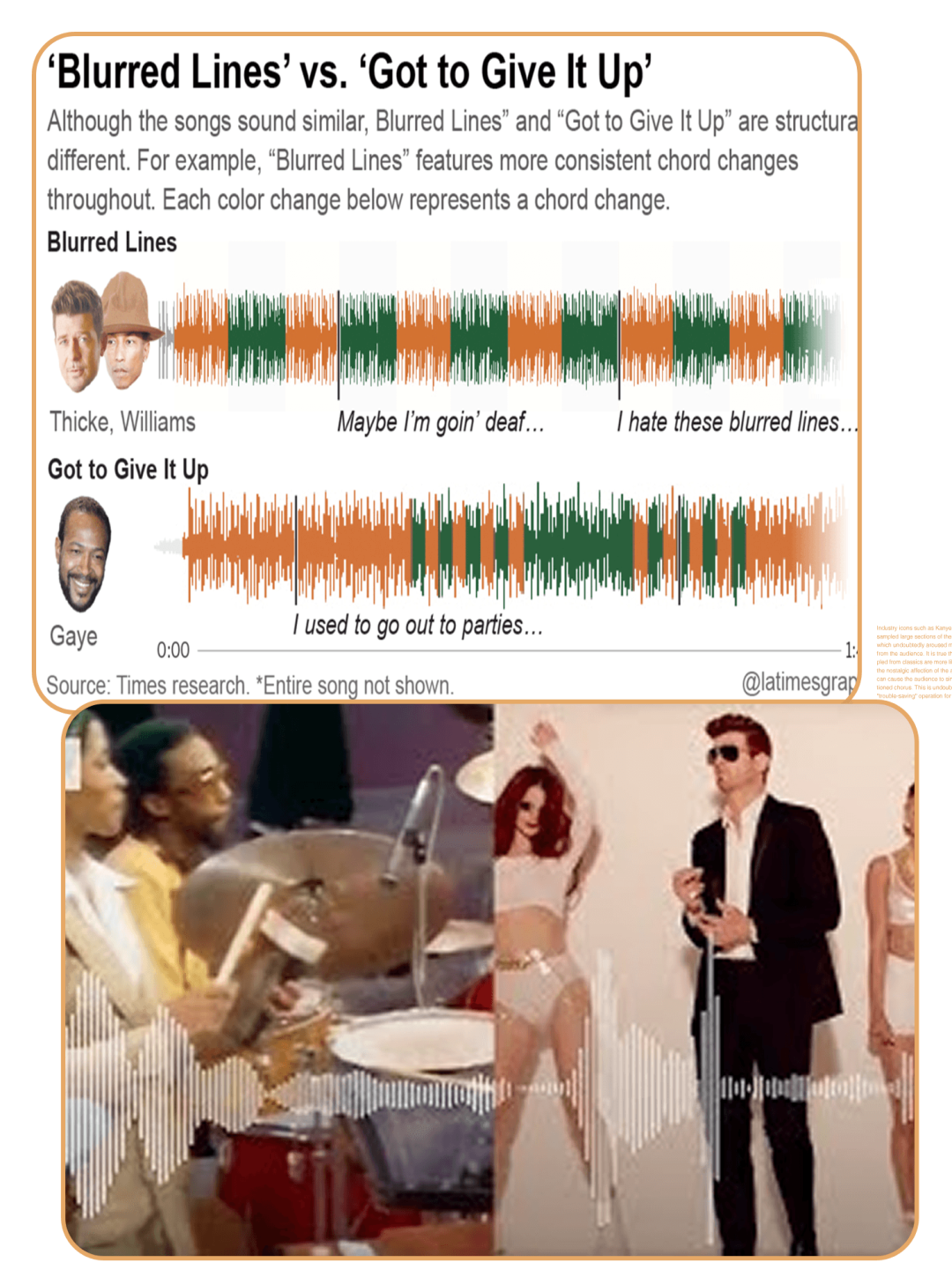 这起案件的争论在于Marvin Gaye的歌曲《Got to Give It Up》与Robin Thicke、T.I.和Pharrell Williams的《Blurred Lines》虽然在听感上有着相似之处,但是游走在边缘地带的音乐编排模式却很难清晰界定,但最终,法院判决T.I.和Pharrell Williams向Gaye的继承人支付赔偿款700万美元。