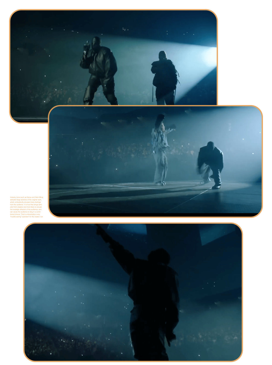 由行业标志性的人物如Kanye、Nicki Minaj这样的行业标杆对于原作的大段大段式的采样,无疑引起了听众的诸多感想。采样自经典的歌曲更加容易引起听众的怀旧好感,并能引起观众条件反射般的合唱,这对创作者来说无疑是一个非常“省事”的操作,但是听众究竟是在为谁的创作而舞?省去的二度创作这种直拿直取的采样方式习惯究竟是助长了创作的风气,亦或是扼杀了创新的底色?