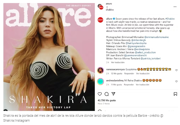 La artista colombiana Shakira es la protagonista de la portada del mes de abril del 2024 de la revista estadounidense especializada en belleza femenina Allure. Allí a la cantante se le preguntó sobre la película que humanizó a la icónica muñeca norteamericana Barbie y cuyo mensaje el medio sintió que iba alineado con el de la barranquillera; no obstante, contrario a lo que pensaba, ella está muy alejada del feminismo que plantea la cinta. “Estoy criando a dos niños. Quiero que ellos también se sientan poderosos”.