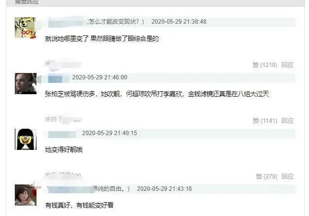 也有人说不仅仅眼睛吧,鼻子脸型也不一样了,有钱真好啊整个气质都变了,而且现在脸部饱满,线条柔和,还挺自然的,果真是钞能力!整个人变柔和了 但是又没有很整容脸,真的好奇是怎么做到的?每次看到她,都只有一句“吃得苦中苦,方为人上人”。