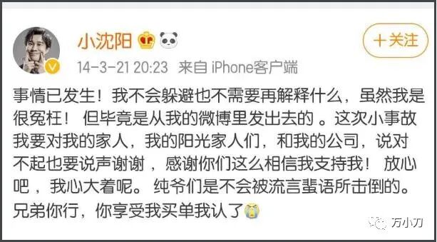 小沈阳得知,赶紧澄清,对外放风说是“用朋友平板电脑登陆过微博,忘记退出”,言外之意是朋友干的,自己是“纯爷们”。