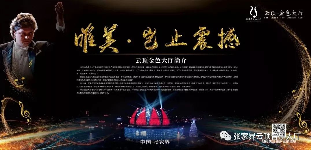 云顶·金色音乐大厅是由张家界云顶集团斥资近 3 亿元人民币打造,单体建筑面积达 2.1 万平方米的音乐圣殿,是国际文化地标建筑,成功造就了云顶•金色大厅六大全球级特色。